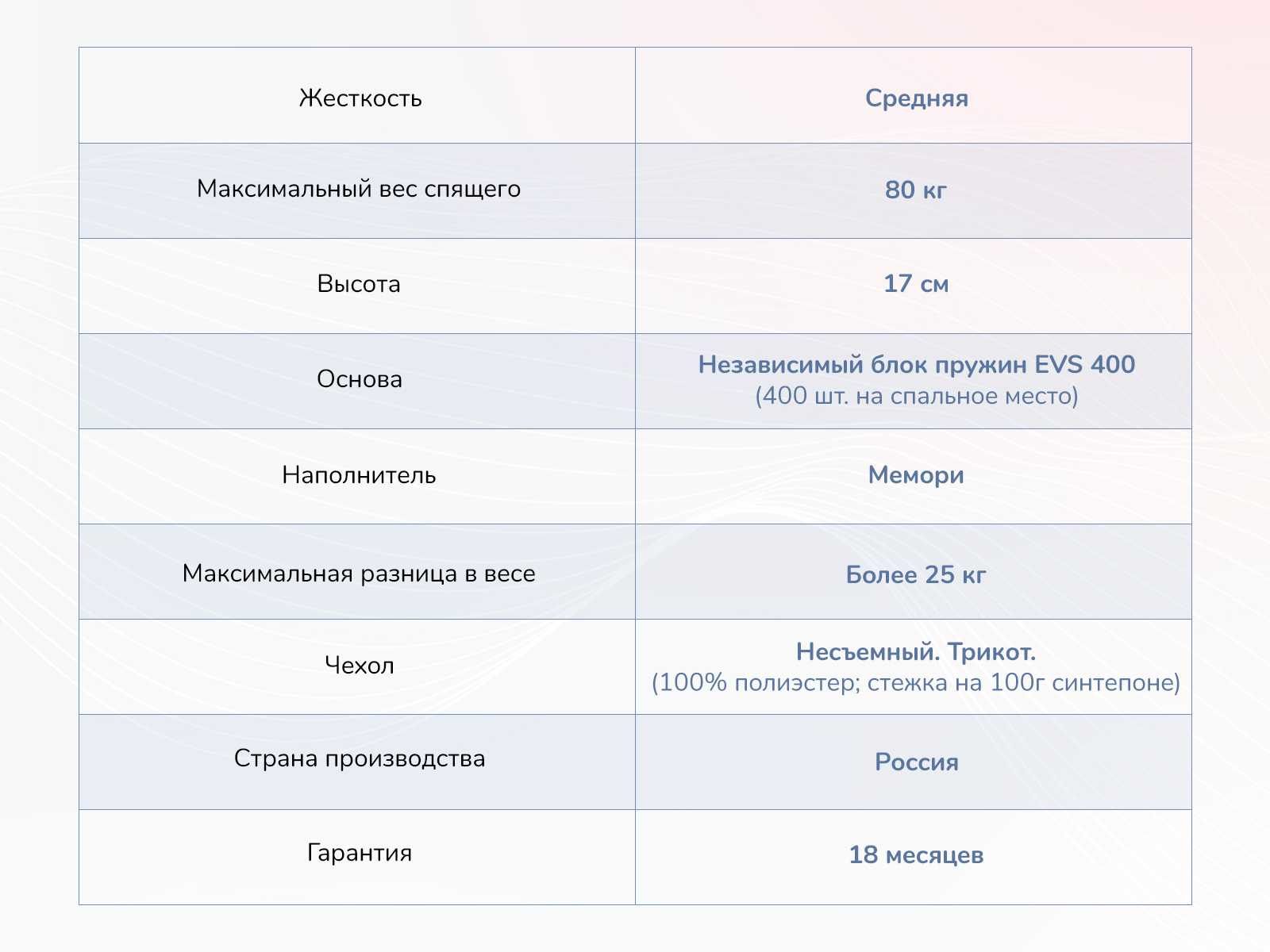 Спальную поверхность представляет уникальная пена Мемори. Собственные свойства позволяют ей не просто считывать формы тела, а запоминать их. Материал очень пластичен и за секунды подстраивается под анатомию человека, поэтому он ощущается с высоким комфортом и удобством.