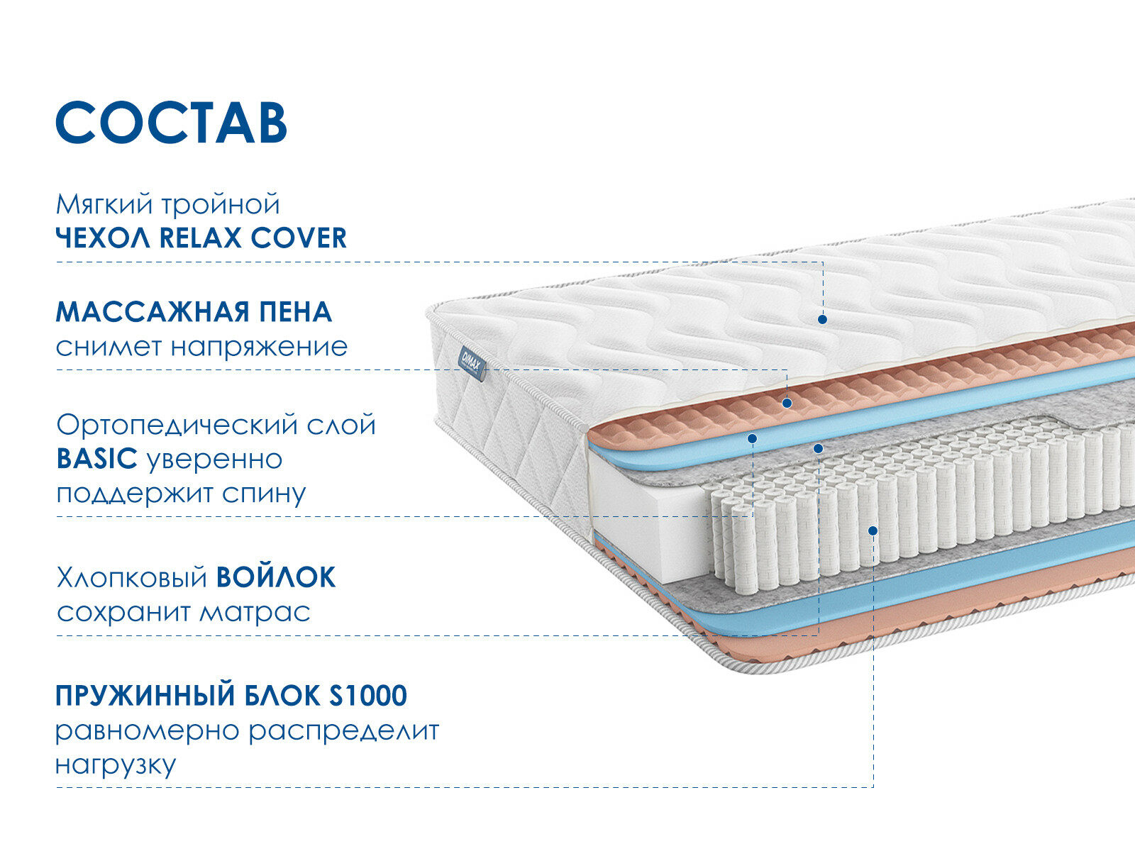 Массажный матрас Димакс Relmas Foam S1000 – одна из самых мягких моделей серии. Изделие отличается усиленной поддержкой благодаря независимому пружинному блоку и качественным гипоаллергенным материалам.