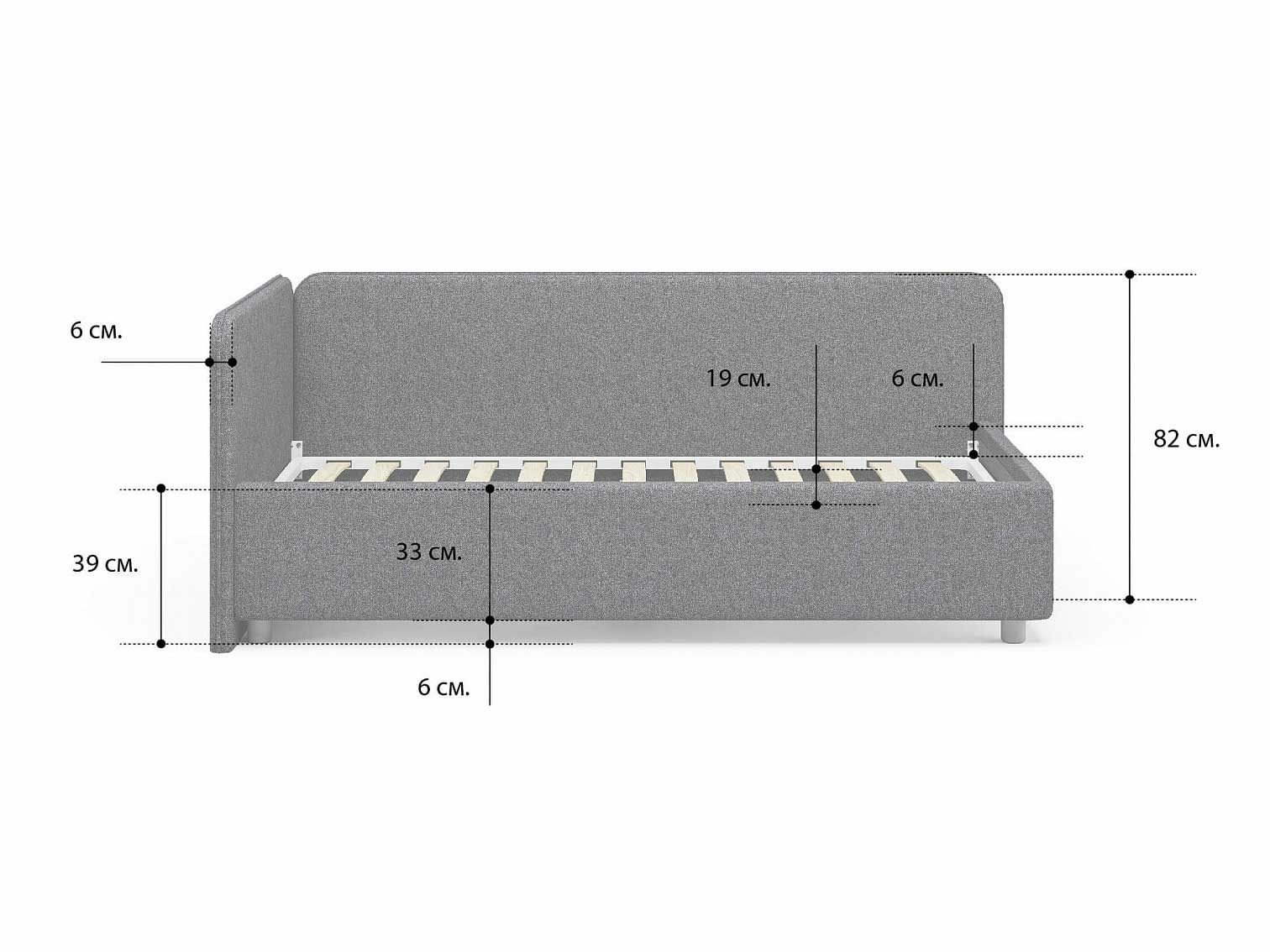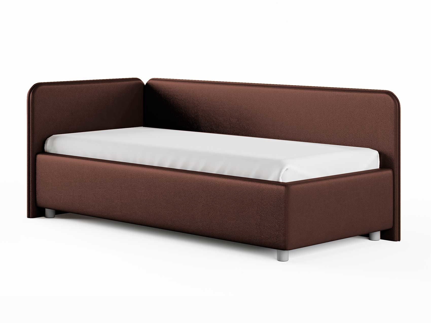 Односпальная кровать в современном стиле. Кровать-софа с одной боковой спинкой. Идеально подходит для квартир с небольшой площадью, детских и подростковых спален, гостевых комнат. Боковую спинку кровати можно изготовить на выбор на правую или левую сторону. Модель изготовлена из ДСП. При необходимости, кровать можно укомплектовать подъемным механизмом с бельевым ящиком.