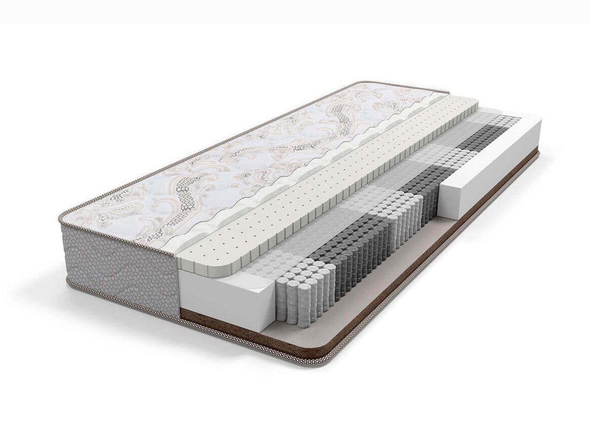Матрас зима лето снабжен блоком независимых пружин MultiPocket, имеющий 7 зон различной степени упругости плотностью 1 000 пружин на спальное место. Благодаря использованию проволоки различного диаметра каждая из зон получает опору соответствующей для нее жесткости, обеспечивая правильное распределение нагрузки. Матрас зима лето разной жесткости сторон на основе натуральных и искусственных наполнителей. С одной стороны материал с эффектом памяти подстраивается под изгибы тела, придавая чувство максимального комфорта, а кокосовая койра с другой стороны обеспечивает максимальный ортопедический эффект благодаря повышенной жесткости.