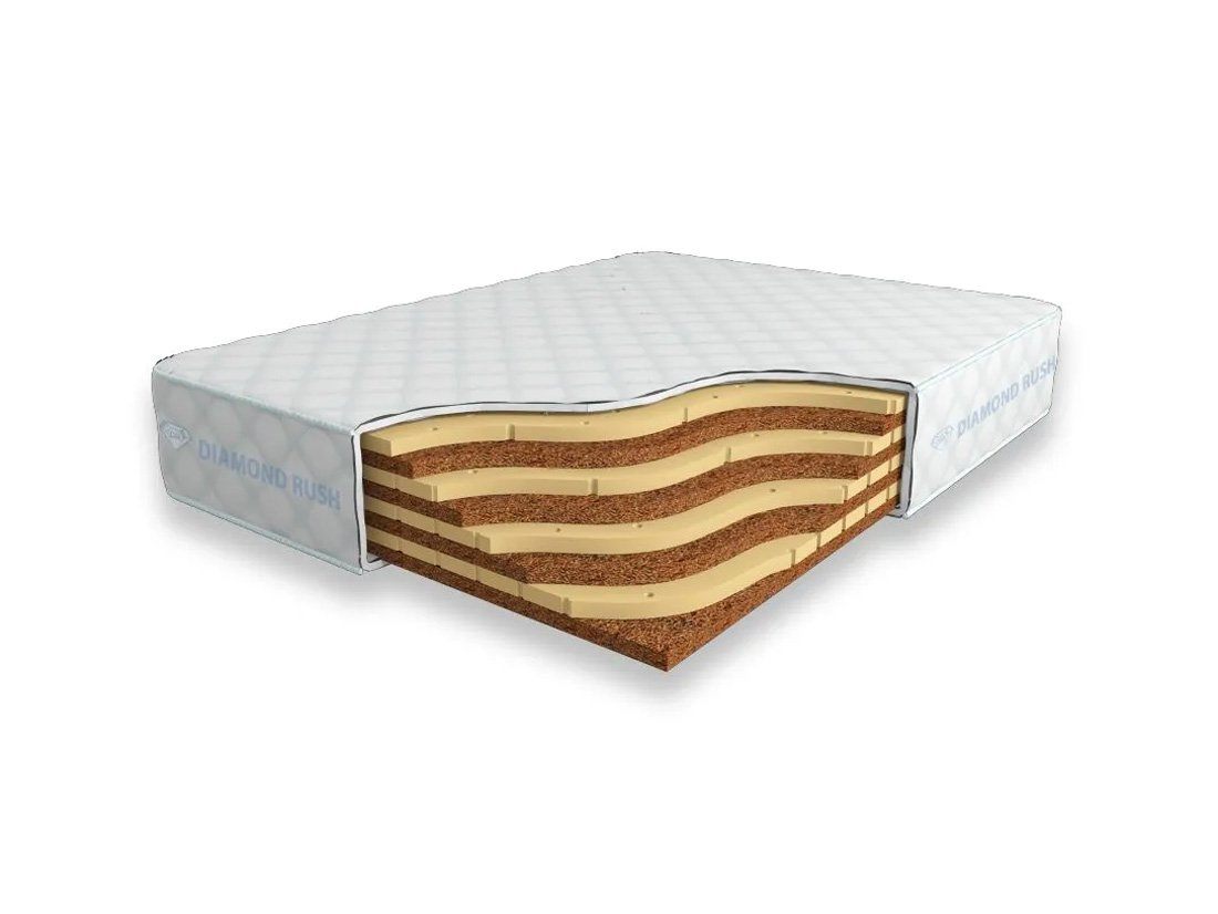 Матрас Diamond Rush SuperMix Cocos Contrast 24 DR является беспружинным, т.е. не имеет в своей основе пружинного блока. В его состав входит чередование слоев латексированной кокосовой койры и натурального латекса с перфорацией. Все слои по 3 см. Эта модель имеет разные по жесткости стороны.