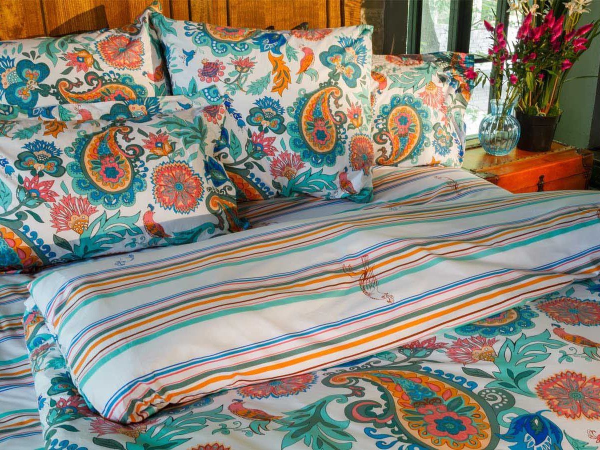 Комплект постельного белья «Утренний мираж» восхищает оригинальностью. Традиционный восточный узор в увеличенном формате выглядит стильно и добавляет интерьеру экзотики. Сочетание пылающего оранжевого, василькового, диковинного красного и холодного зеленого придает комплекту выразительность. Простынь и одна из сторон пододеяльника – в эффектную разноцветную полоску, что делает «Утренний мираж» контрастным и привлекательным. Комплект оживит Вашу спальню и придаст ей очарование утра.