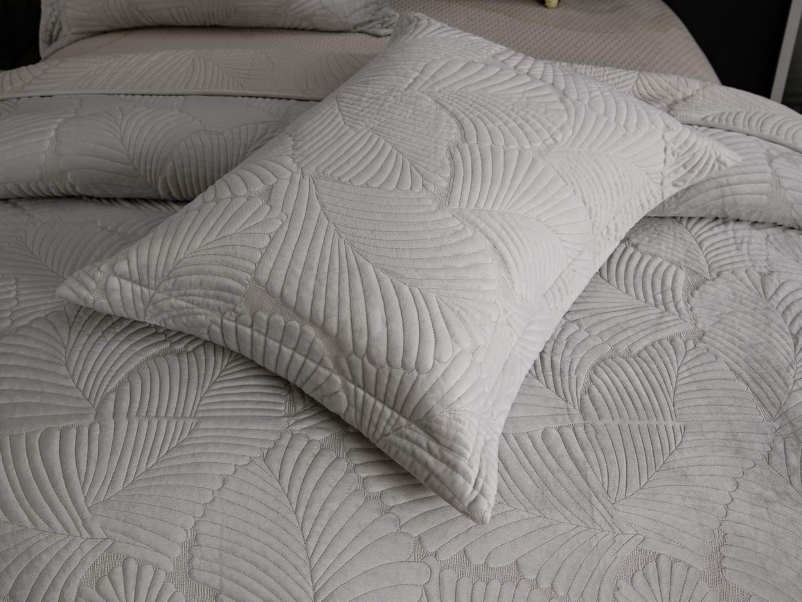 На создание велюрового покрывала Ноэль наших дизайнеров вдохновила ночь в середине лета, когда на раскаленную от жары землю спускается долгожданная прохлада. Роскошная вышивка в виде пальмовых листьев будет напоминать о тени, которую отбрасывают деревья.